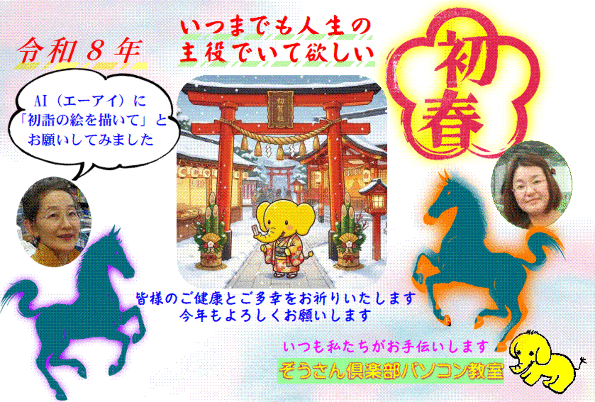 AIに頼んで、教室ロゴのぞうさんを初詣に連れて行ってもらいました。