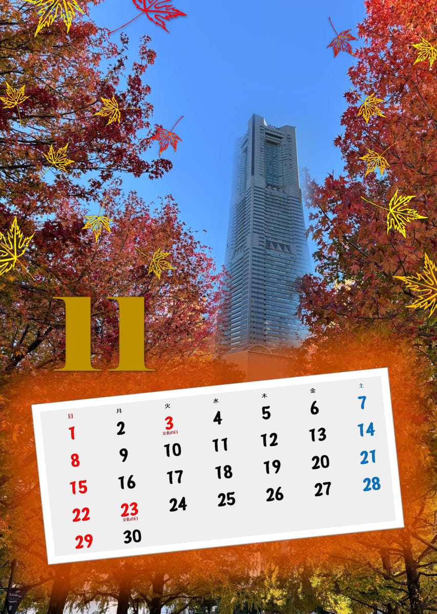 | 作品(写真)紹介 | 横浜ランドマークタワーを背景に、紅葉が色づく十一月の風景を表現したカレンダー作品です。文化の日や勤労感謝の日を取り入れ、秋の季節感を感じられる一枚に仕上げました。 |