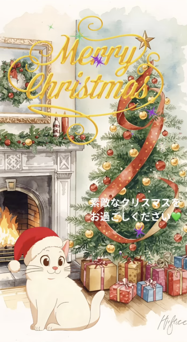CANVAで作成したクリスマス動画です。背景と赤いサンタ帽をかぶった猫をAIで作成しました。