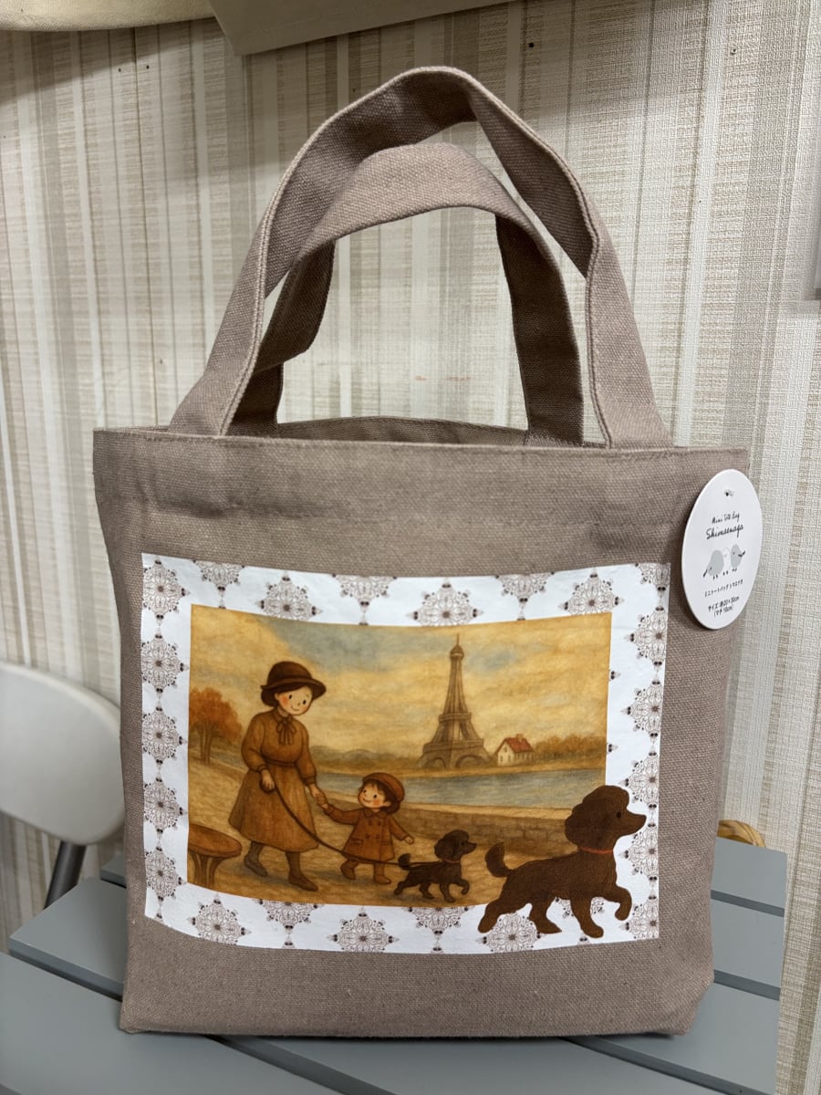 | 作品(写真)紹介 | AIを使って画像生成を初挑戦しました。「フランスのセーヌ川のほとりを犬の散歩する親子をかわいらしく絵本風に描いてください」そんな指示から完成した画像使ってをエコバックにしました。 |
