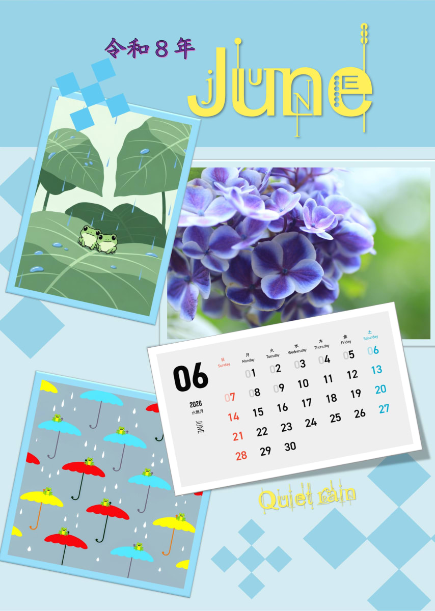 | 作品(写真)紹介 | アジサイの写真に合わせて、フリー素材から見つけた可愛らしいカエルとカラフルな傘のイラストがポイントです。雨の日でもウキウキ、明るいカレンダーになるように作成しました。 |