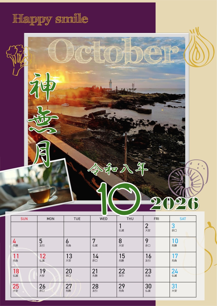 授業で習った素敵なカレンダーの10月に、思い出の旅行の写真を入れました。南房総の野島崎灯台と鮮やかな朝焼けです。背景や文字の色で印象が大きく変わり、時間をかけてやっと決まりました。