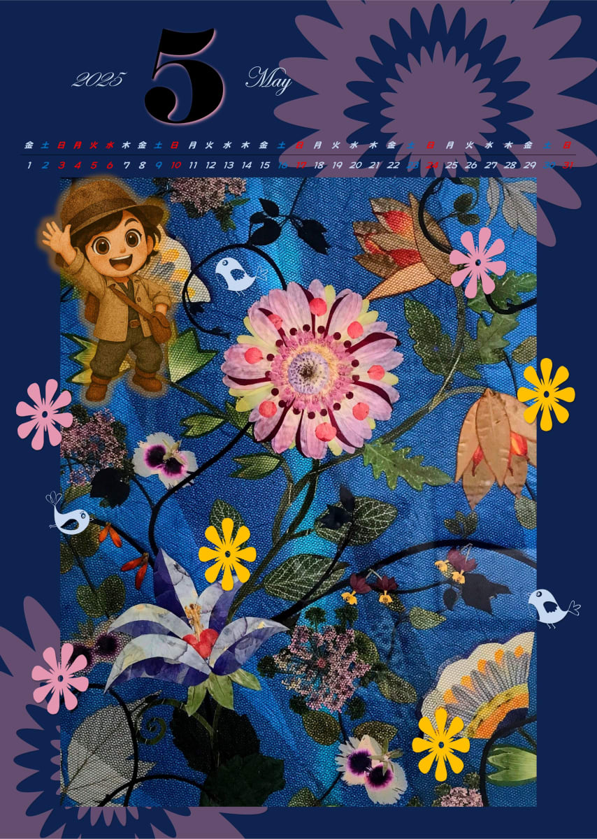 | 作品(写真)紹介 | 「押し花×AIキャラクターの女の子×絵フォント」の組み合わせに挑戦したカレンダーです。長年続けてきた押し花と、今の時代ならではのAI生成で、試行錯誤を重ねてようやく形になりました。 |