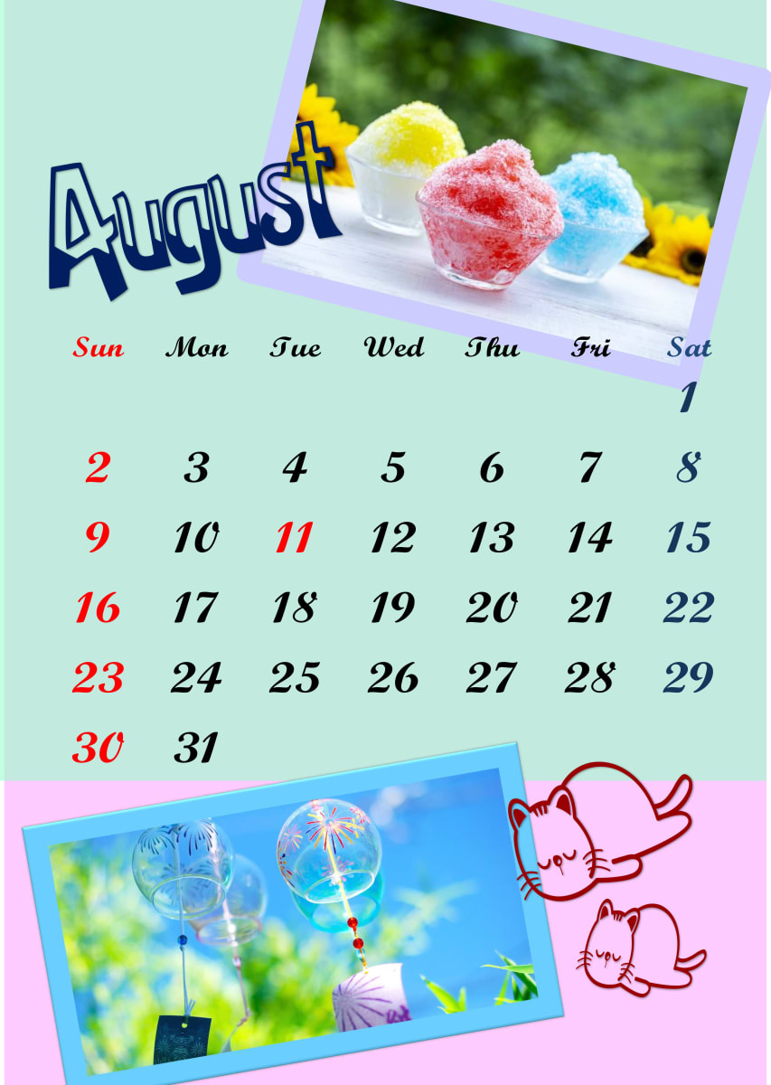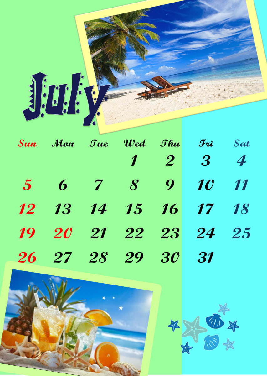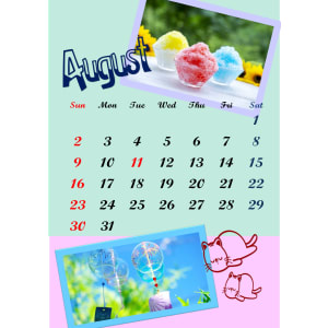 大好きな夏の要素をぎゅっと詰め込んだカレンダーです。パイナップルや冷たいドリンクの写真をメインに、ヒトデや貝殻のモチーフを散りばめて賑やかに仕上げました。こだわった点はフォントの選択です。7月の力強さと躍動感が伝わるよう、個性的でデザイン性の高い書体を選びました。
