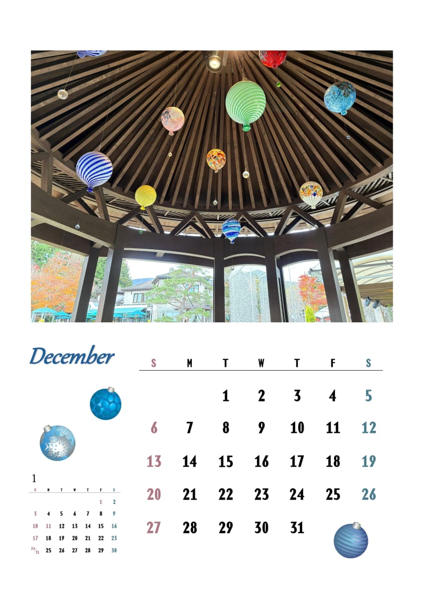 | 作品(写真)紹介 | 木の温もりに包まれたガゼボのすきまから、ガラスの森がそっと姿をのぞかせます。気球のオーナメントがきらめきを散らし、ブルーの光が冬の空気に溶けていくようです。 |