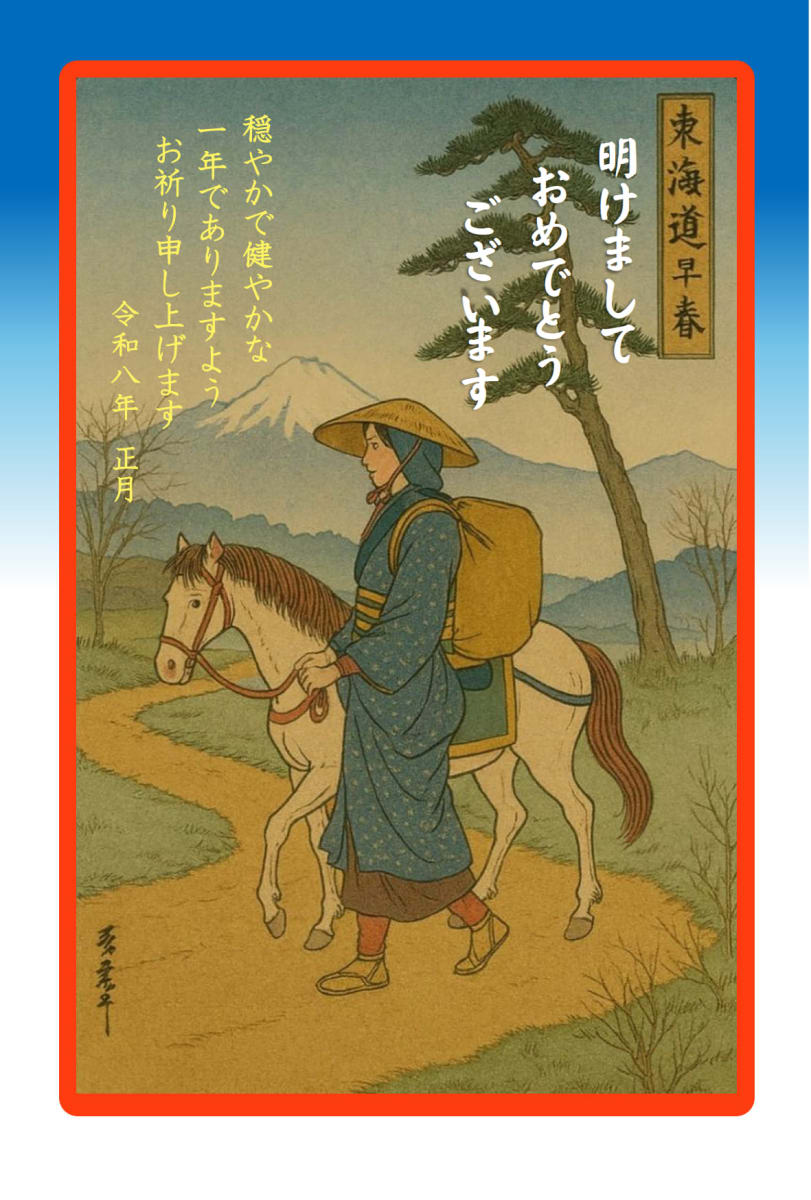 生成AIで、馬を連れての、のどかな旅姿を作成しました。