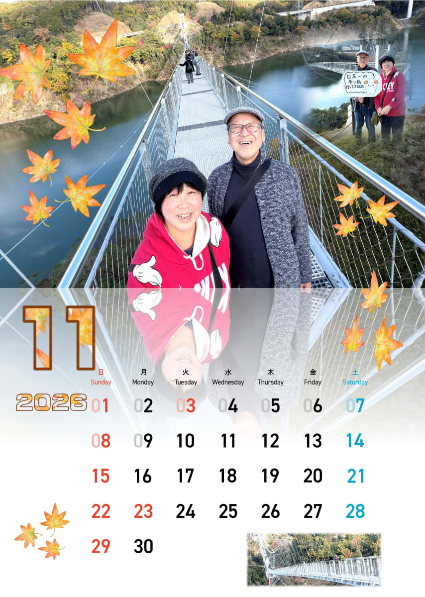 | 作品(写真)紹介 | 「いばきた」は、2025年に誕生した全長420mの新しい吊り橋。渡る前の高揚感、そして眼下に広がる湖の美しさは格別です。鮮やかに色づく秋の情景とともに、この場所で感じた胸の高鳴りを一枚に込めました。 |