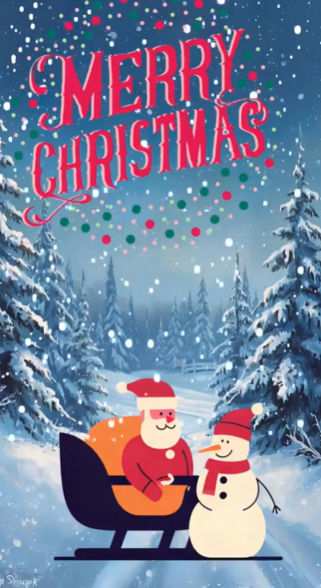 CANVAでクリスマスの動画を作成しました。サンタと雪だるまが一緒にそりに乗っているイラストと背景をAIで作成しました。