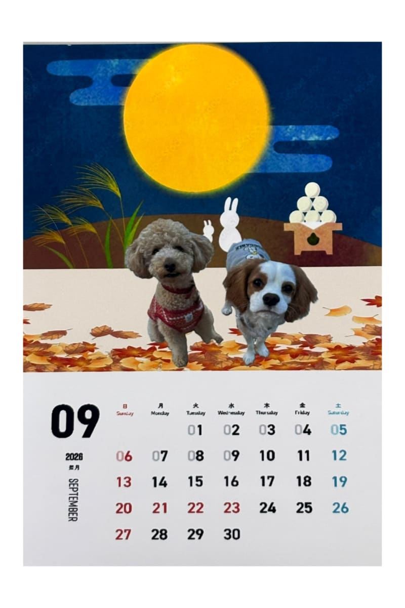 ペイントとワードで作成したとってもお気に入り、9月のカレンダー「わんこのお月見」です