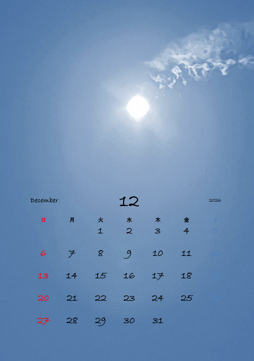 | 作品(写真)紹介 | 12月のコールドムーンを撮影したら、青い情景になりました。きれいな青を生かして、12月のカレンダーに仕上げました。 |