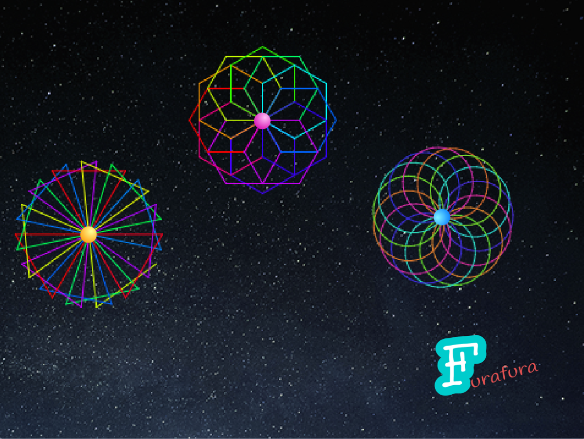 | 作品(写真)紹介 | 月に一度のおとなのためのScratch講座でスピログラフアートに挑戦しました。描く形や角度、速さで表現が変わるのでいろいろ試してみました。 Scratchサイトはこちら(緑のはたを押してスタート!)