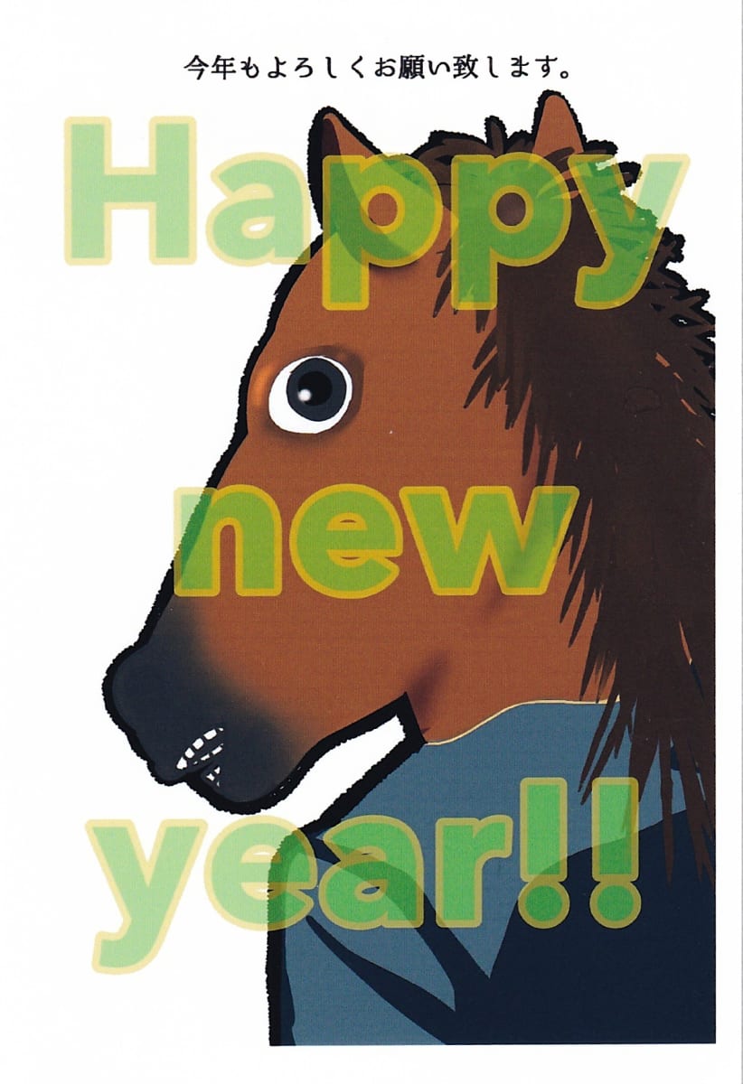 | 作品(写真)紹介 | 手書きした馬のイラストを主役にしたオリジナル年賀状です。