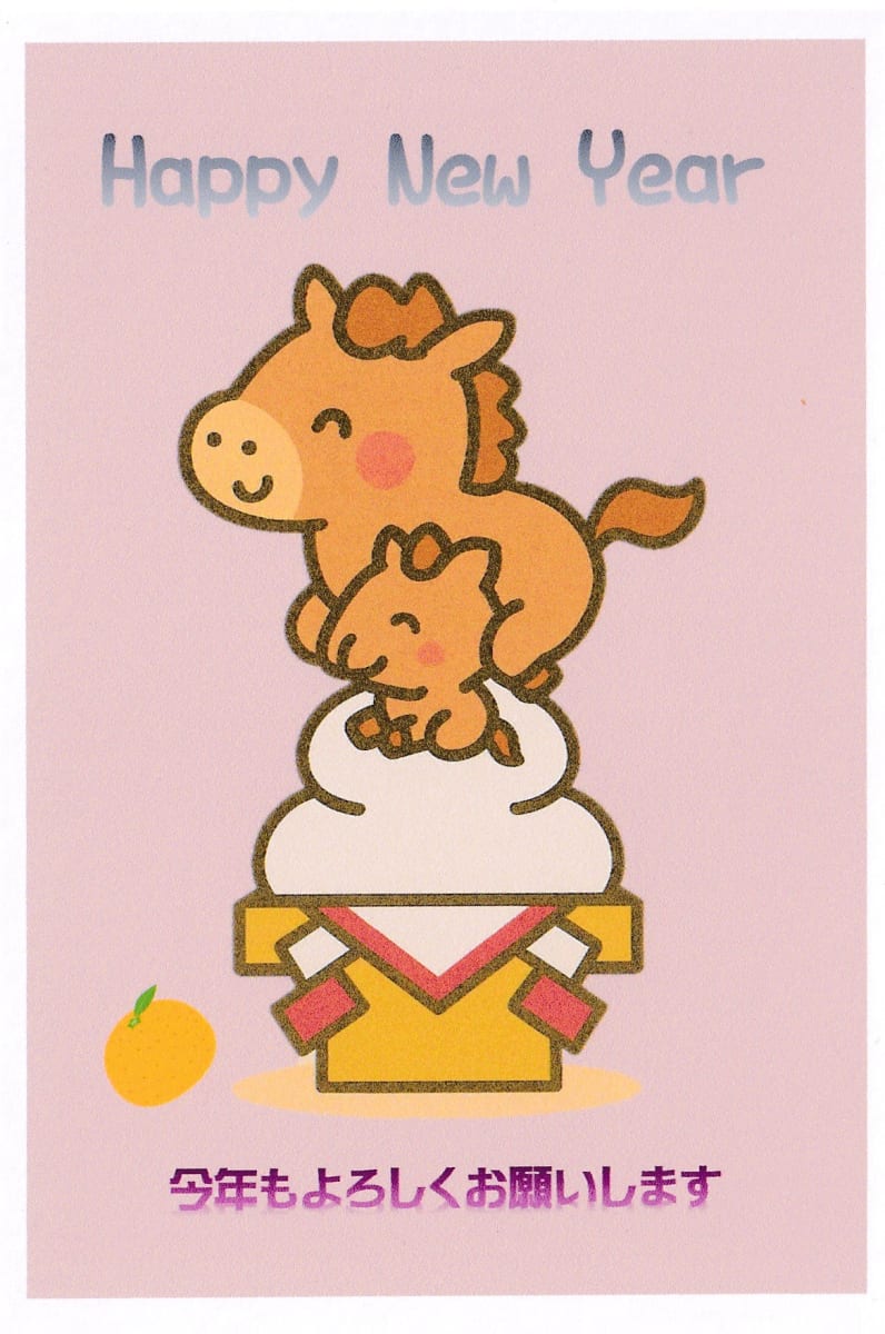 | 作品(写真)紹介 | AIのコパイロットでにっこり笑顔の馬の親子を鏡餅に乗せて、ワードを使って「コロンと転がったみかん」や文字を入れました。 |