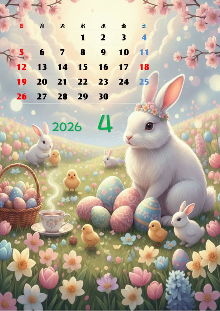 | 作品(写真)紹介 | 4月の春らしさをテーマにAIで画像を生成して背景にして、エクセルで作成したカレンダーをワードへ貼り付けました。可愛いウサギが気に入っています |