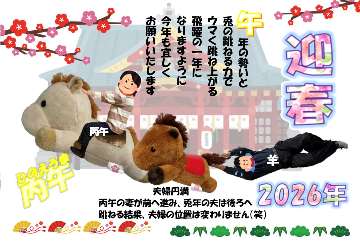 | 作品(写真)紹介 | あっという間に年末がやってきて、恒例の夫婦年賀状対決です。丙午の私は今年も迷わず突き進み、羊年の代役をこなす兎年の夫は、全力でブレーキをかけながら、支えてくれています。 |