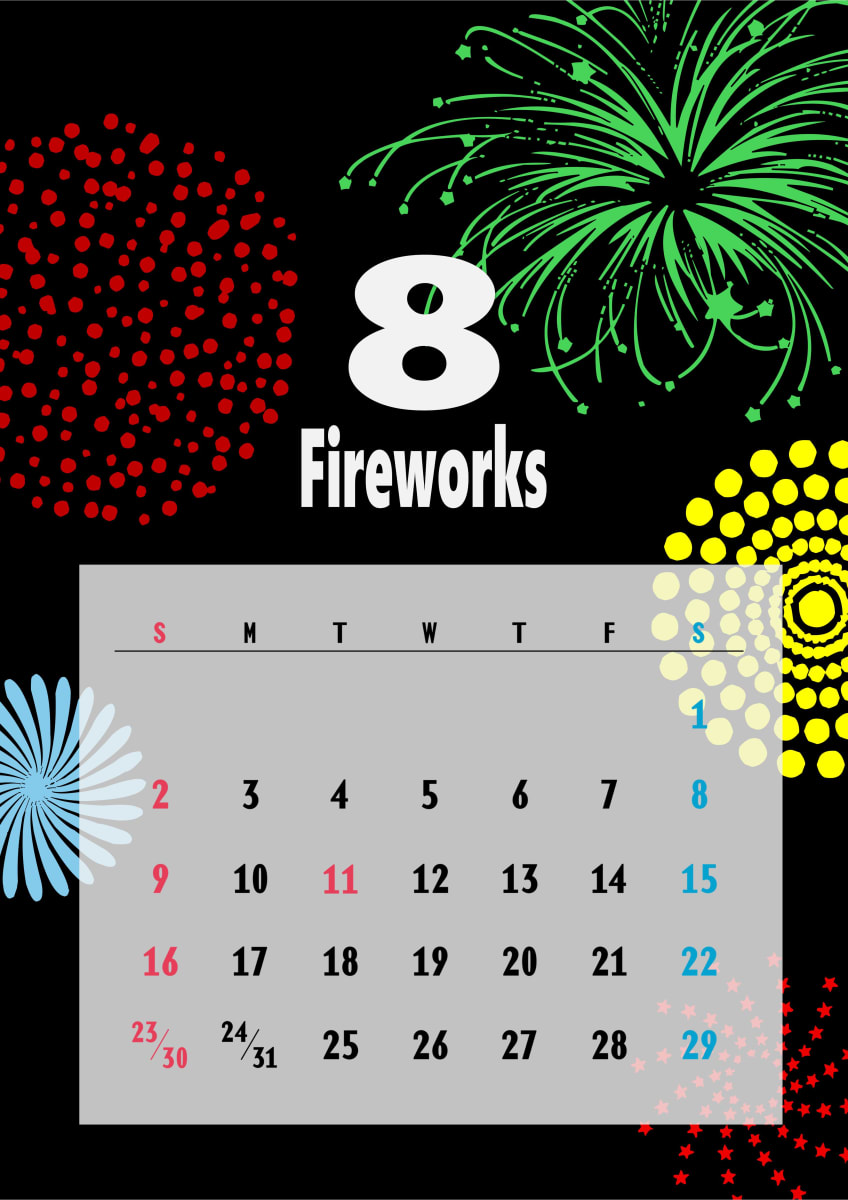 | 作品(写真)紹介 | 今年は全部の月を、テキストのカレンダーを参考に、楽しく作成しました。8月は絵フォントの色を工夫して、カラフルな花火にしてみました。 |